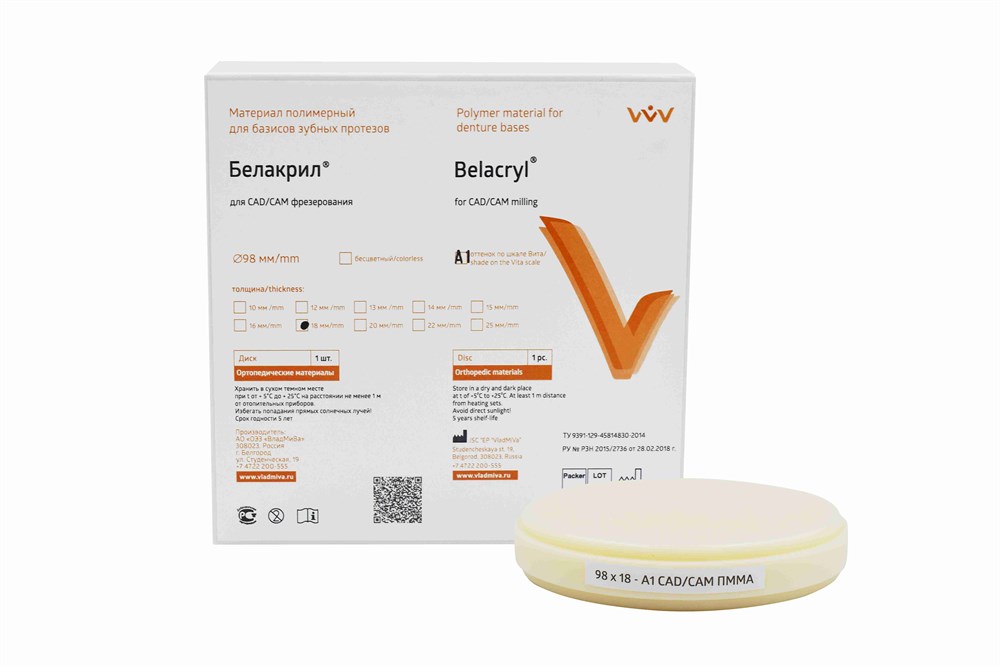 Материал «Белакрил» для CAD/CAM фрезерования выпускается в виде заготовок (дисков), изготовленных из полиметилметакрилата. Диски могут быть бесцветными или окрашенными в один из оттенков по шкале Вита.