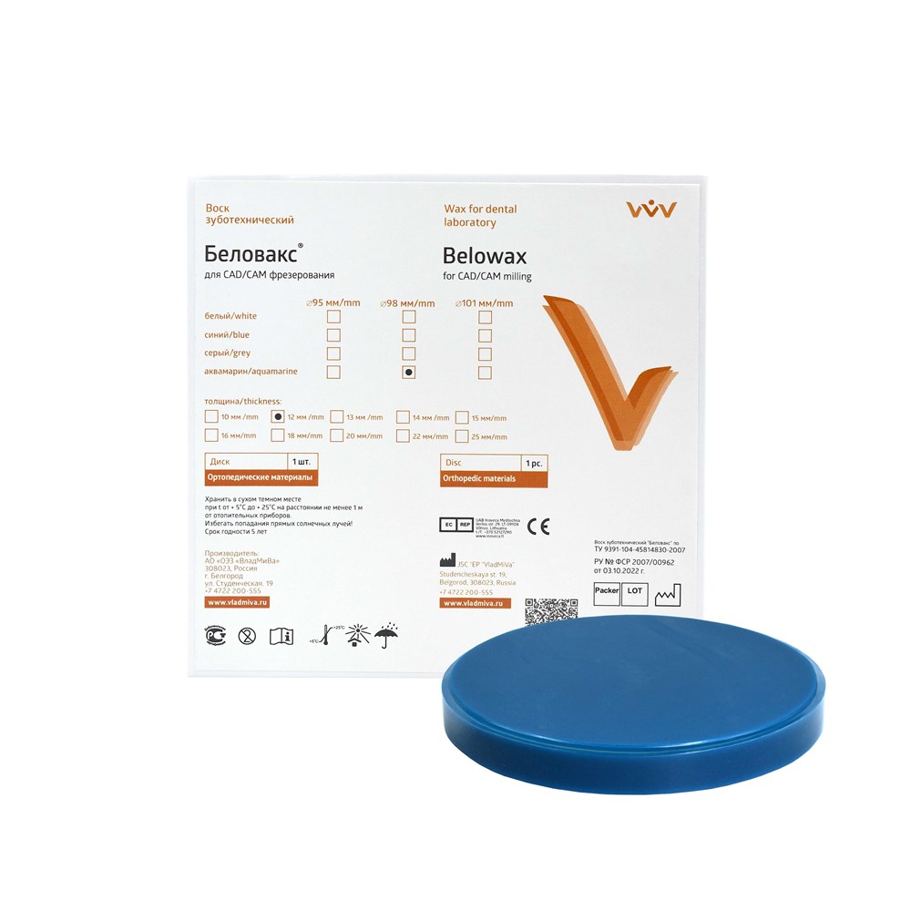 Воск «Беловакс» для CAD/CAM фрезерования выпускается в виде дисков изготовленных из смеси парафина и полиэтилена. Диски могут быть окрашены в синий, серый или белый цвет. Воск различного цвета не отличается по своим физико-химическим свойствам.