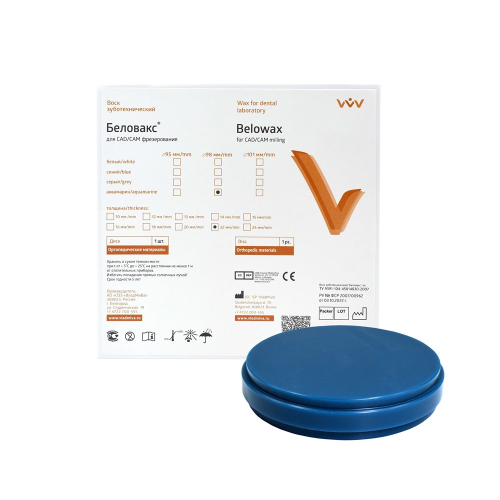 Воск «Беловакс» для CAD/CAM фрезерования выпускается в виде дисков изготовленных из смеси парафина и полиэтилена. Диски могут быть окрашены в синий, серый или белый цвет. Воск различного цвета не отличается по своим физико-химическим свойствам.