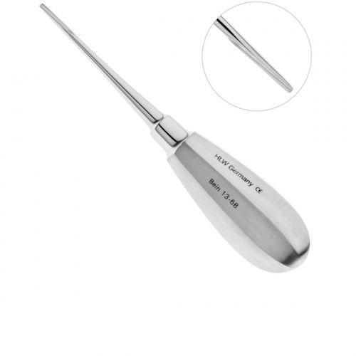 Элеватор HLW 13-6B Bein, прямой, 2 мм. Элеватор конструкции Бейна применяется для удаления корней и зубов на верхней и нижней челюсти. Компания HLW Dental Instruments является производителем и поставщиком инструмента. Рабочая поверхность прямого элеватора имеет прямоугольный край и желобовидное углубление, что способствует проведению операции по удалению корней и зубов в ротовой полости, а также упрощает введение инструмента между корнем зуба и стенкой альвеолы. Ширина рабочей части инструмента 2 мм. Полая укороченная ручка элеватора плавно переходит в функциональный стержень инструмента. Элеватор надежно фиксируется и не скользит в руке, благодаря граням на внешней поверхности ручки инструмента.