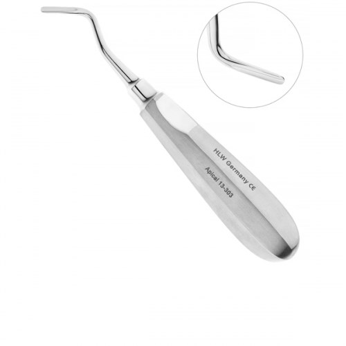Элеватор HLW 13-303 Apical, изогнутый на себя, 3 мм применяется для удаления корней и зубов на нижней челюсти, производства компании HLW Dental Instruments. Рабочая часть изогнутого инструмента имеет форму желоба со слегка закругленным краем. Поверхность лезвия с желобовидным углублением ориентирована на себя, так как после внедрения элеватора между корнем зуба и стенкой альвеолы врач осуществляет вывихивание зуба вращением рукоятки инструмента по ходу часовой стрелки. Ширина рабочей части 3 мм. Элеватор надежно фиксируется и не скользит в руке, благодаря граням на поверхности и выемкам под пальцы на ручке инструмента. Такая конструкция очень удобна в использовании и способствует успешному проведению операции.