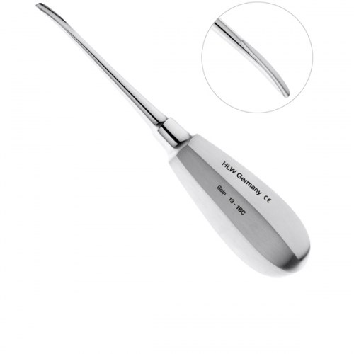 Элеватор HLW 13-1BC Bein, изогнутый, 3 мм. Элеватор конструкции Бейна применяется для удаления корней и зубов на верхней и нижней челюсти. Компания HLW Dental Instruments является производителем и поставщиком инструмента. Элеватор удобен в использовании. На поверхности ручки инструмента расположены грани, которые обеспечивают надежную фиксацию и предотвращают скольжение элеватора в руке. Ширина щечки инструмента 3 мм. Рабочая часть элеватора изогнута по плоскости, имеет заостренный край и выемку в форме жёлоба, что позволяет ввести инструмент между корнем зуба и стенкой альвеолы, и без затруднений провести операцию по удалению корней и зубов в ротовой полости.