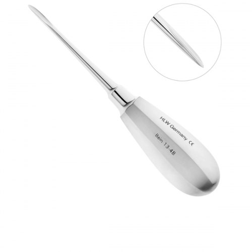 Элеватор HLW 13-4B Bein, прямой, 3 мм. Элеватор конструкции Бейна применяется для удаления корней и зубов на верхней и нижней челюсти. Компания HLW Dental Instruments является производителем и поставщиком инструмента. Рабочая поверхность прямого элеватора имеет прямоугольный край и желобовидное углубление, что способствует проведению операции по удалению корней и зубов в ротовой полости, а также упрощает введение инструмента между корнем зуба и стенкой альвеолы. Ширина рабочей части инструмента 3 мм. Полая укороченная ручка элеватора плавно переходит в функциональный стержень инструмента. Элеватор надежно фиксируется и не скользит в руке, благодаря граням на внешней поверхности ручки инструмента.