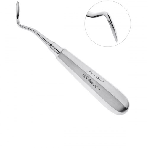 Элеватор HLW 13-2F изогнутый от себя Flohr, 3 мм. Для удаления корней и зубов на нижней челюсти применяется элеватор конструкции Флоха производства известной компании HLW Dental Instruments. Рабочая часть изогнутого инструмента имеет форму желоба с закругленным концом. Поверхность лезвия с желобовидным углублением ориентирована на себя, так как после внедрения элеватора между корнем зуба и стенкой альвеолы врач осуществляет вывихивание зуба вращением рукоятки инструмента против часовой стрелки. Ширина рабочей части 3 мм.