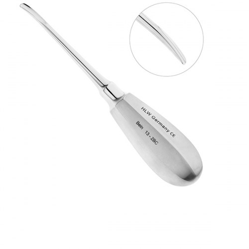 Элеватор 13-2BC Bein, изогнутый, 4 мм. Для удаления корней и зубов на верхней и, в ряде случаев, на нижней челюсти применяется элеватор конструкции Бейна производства немецкой компании HLW Dental Instruments. Щечка изогнутого инструмента имеет овальную форму, заостренный край и выемку в форме жёлоба, что обеспечивает легкое введение элеватора в лунку зуба и позволяет без особых усилий удалить корень или зуб в ротовой полости. Ширина рабочей части инструмента 4 мм. Восьмигранная укороченная ручка элеватора обеспечивает надежную фиксацию и предотвращает скольжение инструмента в руке.