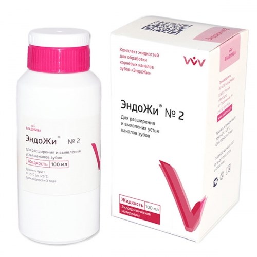 «ЭНДОЖИ №2» - для выявления устья каналов и их расширения, содержит смесь калиевой и натриевой солей ЭДТА (17%) и центимониум бромид – поверхностно-активный антисептик, обеспечивающий пенообразование, быстрое проникновение препарата в микроканальца и предотвращающий оседание дентинных опилок, что облегчает их извлечение из канала.