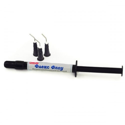 Материал «Флекс флоу» - это мономерная композиция на основе олигоуретанметакрилатов, и олигометакрилатов с тиксотропной добавкой. Отверждается светом длиной волны 450-550 нм. в Течение 30 секунд. После отверждения «Флекс флоу» обладает высокой эластичностью, обеспечивает высокую герметичность закрываемых полостей. Удаляется без применения вращающихся Инструментов при помощи зонда.