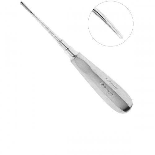 Люксатор HLW 13-25LX изогнутый, 3 мм производства немецкой компании HLW Dental Instruments, изготовлен для атравматичного удаления корней и зубов на нижней и верхней челюсти. Соединительный стержень инструмента удлиненный и имеет небольшой изгиб на конце, что позволяет использовать люксатор в глубоких и труднодоступных участках полости рта. Внутренняя поверхность рабочей части инструмента повторяет форму зуба, а острые и тонкие режущие края эффективно подрезают периодонтальную связку. В отличие от традиционных методов экстракции зуба, применение люксаторов менее травматично. Если ручка люксатора удобна в использовании, то и врачу проще провести операцию по удалению корней или зубов. У данной модели инструмента помимо граней на внешней поверхности есть еще и выемки под пальцы, благодаря которым люксатор не скользит и прочно держится в руке.