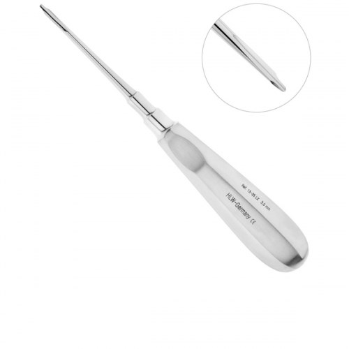 Люксатор HLW 13-35LX прямой, 3 мм предназначен для атравматичного удаления корней и зубов на нижней и верхней челюсти. Производителем инструмента является компания HLW Dental Instruments. Внутренняя поверхность щечки люксатора тонкая, повторяет форму зуба и имеет небольшую, острую, овальную выемку на конце, что позволяет глубоко ввести инструмент между корнем зуба и костной тканью лунки и подрезать периодонтальную связку. Удлиненная рабочая часть и соединительный стержень люксатора обеспечивают доступ к труднодоступным участкам полости рта. Ручка люксатора легкая, гладкая, с продольными гранями на поверхности и выемками под пальцы с двух сторон. Проводить операцию по удалению корней или зубов инструментом с такой ручкой очень удобно.