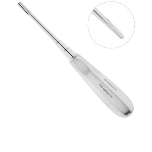 Люксатор HLW 13-23LX прямой, 5 мм изготовлен для атравматичного удаления корней и зубов на нижней и верхней челюсти немецкой компанией HLW Dental Instruments. Широкая, тонкая и острая щечка, а также удлиненный соединительный стержень инструмента позволяют глубоко ввести люксатор между корнем зуба и костной тканью лунки, эффективно подрезать периодонтальную связку и аккуратно извлечь корень или зуб из лунки. Стандартная ручка люксатора имеет грани на поверхности и выемки под пальцы с двух сторон, что препятствует скольжению фаланг пальцев в перчатке. Такая конструкция ручки очень удобна в использовании и способствует успешному проведению операции.