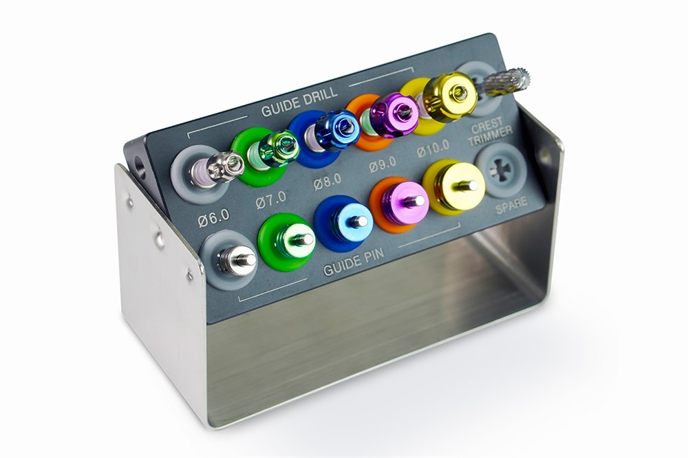 - Пилотные сверла с позиционирующими ограничителями — силиконовая пружина удерживает титановый ограничитель вплотную к верхушке сверла, обеспечивая тем самым удобство и точность при формировании пилотного отверстия под позиционер.