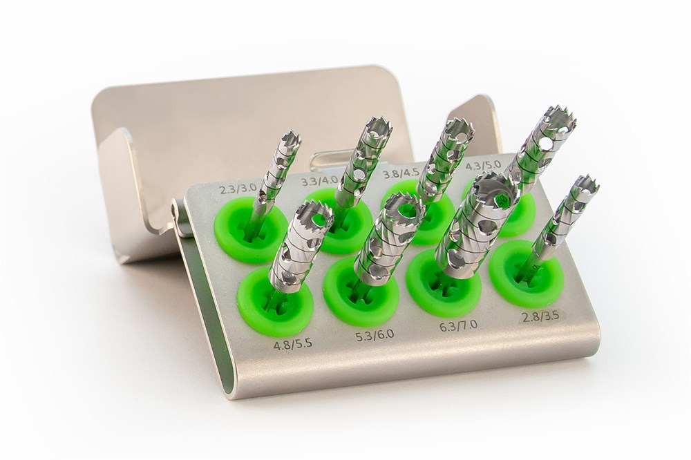 - Минимальные потери костной ткани благодаря тонким стенкам коронок трепанов размером 0.35 мм;