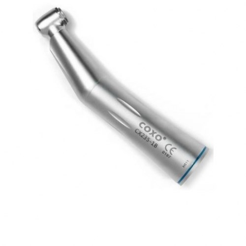 COXO CX235-1B - это угловой наконечник используется стоматологом при терапевтическом и ортопедическом лечении. При производстве наконечника применяются качественные материалы, обеспечивающие его долгий срок эксплуатации. Материалом корпуса является нержавеющая сталь, что гарантирует устойчивость к коррозии. Показатель редукции 1:1. CX235-1B оснащен кнопочным зажимом, благодаря которому осуществляется надежное крепление и удобная замена стоматологического бора. Стоматологический наконечник CX235-1B изготавливается со стандартной головкой и одноточечным спреем. Охлаждение бора происходит с помощью внутренней подачи воды, что предотвращает перегрев инструмента и тканей зуба. Максимальная скорость вращения составляет 40 000 об/мин. Особенность заключается в изогнутой форме, позволяющая выполнять работу на труднодоступных участках.