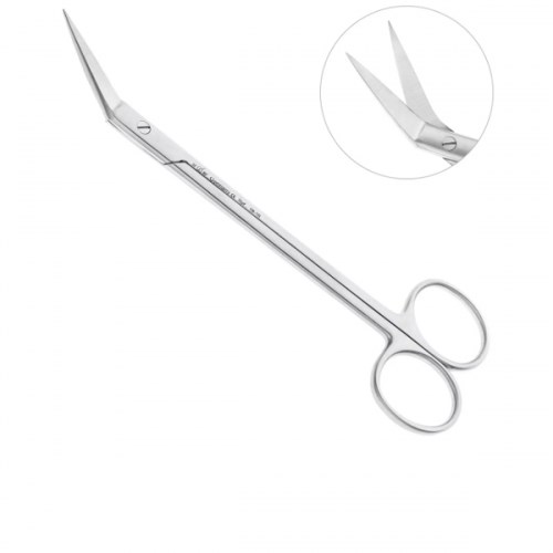 Ножницы HLW 19-10 двойные угловые Locklin,16,0 см предназначены для работы с мягкими тканями челюстно-лицевой области и шовным материалом. Производителем инструмента является компания HLW Dental Instruments. Рабочая часть ножниц стандартной треугольной формы с тонкими, острыми режущими краями. На одном из лезвий инструмента расположены зубчатые режущие грани, предотвращающие скольжение ножниц по поверхности мягких тканей. Инструмент имеет двойной разнонаправленный изгиб по ребру, который облегчает введение ножниц в глубокодоступные участки полости рта и способствует проведению операции по коррекции мягких тканей и шовного материала. Инструмент предназначен для использования как левой, так и правой рукой. Ручки ножниц имеют стандартные кольцевые хваты для указательного и большого пальцев.