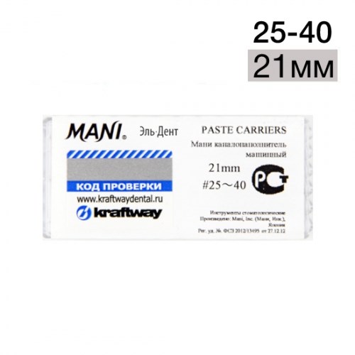 Mani Paste Carriers (Каналонаполнители Мани) - это машинный стоматологический эндодонтический инструмент с рабочей частью в форме спирали. Материал рабочей части - нержавеющая сталь, материал хвостовика – нержавеющая сталь.