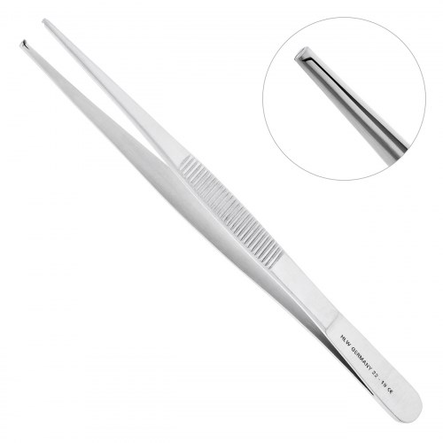 Пинцет HLW 22-19 хирургический, 14 см изготовлен компанией HLW Dental Instruments, предназначенный для внесения и удаления изо рта вспомогательных и диагностических принадлежностей, а также различных манипуляций в ротовой полости. Прямые рабочие части инструмента на конце внутренней поверхности имеют зубчатые элементы, которые позволяют удобно захватывать и удерживать мягкотканный материал, не приводя к плоскостному сдавливанию тканей. Поперечные бороздки на внешних поверхностях пинцета предотвращают скольжение пальцев в перчатке и позволяют снизить нагрузку на руку при проведении хирургических операций в полости рта.
