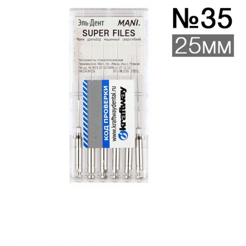 Mani Super Files (Супер Файлы Мани) - Машинный режущий стоматологический эндодонтический инструмент со спиральной нарезкой рабочей части. Рабочая часть и стержень отличаются повышенной гибкостью. Материал рабочей режущей части - нержавеющая сталь, материал хвостовика – нержавеющая сталь.
