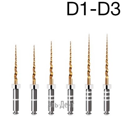 Описание: Ultratapers Gold набор: D1-D3 (D1x2, D2x2, D3x2), стерильные машинные файлы для перелечивания, никель-титан, (6шт.).Eurofile