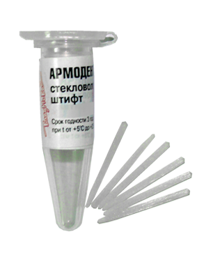 Штифты стекловолоконные «Армодент» изготовленыиз плетеных стеклянных волокон связанных метакрилатным олигомером Бис-ГМА и усиленных пирогенной двуокисью кремния. Стекловолоконные штифты позволяют создать надежную опору для реставрационной конструкции. Химическое сродство олигомерной матрицы штифтов к композитным материалам способствует увеличению адгезии и обеспечивает монолитность реставрации.