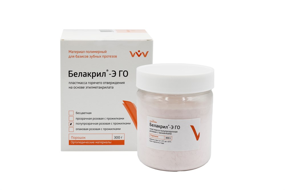 Базисные материалы «Белакрил» выпускаются в виде двух компонентов - порошка, содержащего полиэфиры метакриловой кислоты, катализатор реакции полимеризации перекись бензоила, и жидкости, содержащей мономер метилметакрилат (М) и/или мономер этилметакрилат (Э), после смешивания порошка с жидкостью образуется полимер, твердеющий при нагревании (горячего отверждения) - ГО или без нагревания (самотвердеющий) - ХО. Базисные материалы «Белакрил» отличает высокая технологичность, простота и быстрота изготовления изделий, имеющих высокое качество, функциональную долговечность, натуральный внешний вид и биосовместимость.
