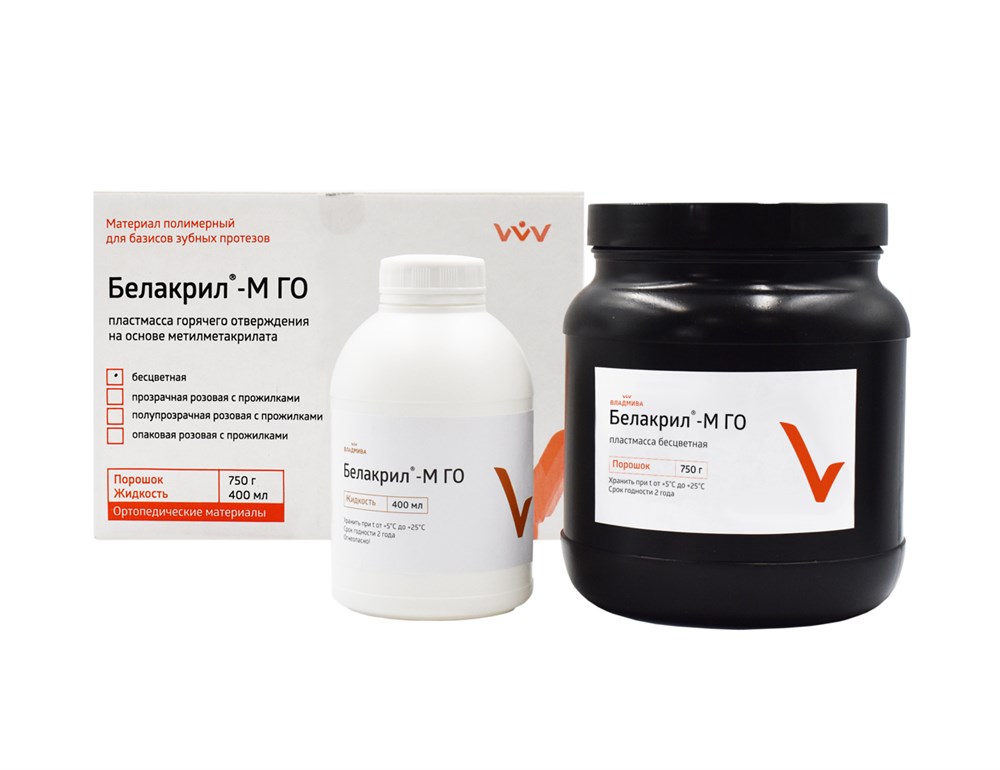 Базисные материалы «Белакрил» выпускаются в виде двух компонентов - порошка, содержащего полиэфиры метакриловой кислоты, катализатор реакции полимеризации перекись бензоила, и жидкости, содержащей мономер метилметакрилат (М) и/или мономер этилметакрилат (Э), после смешивания порошка с жидкостью образуется полимер, твердеющий при нагревании (горячего отверждения) - ГО или без нагревания (самотвердеющий) - ХО. Базисные материалы «Белакрил» отличает высокая технологичность, простота и быстрота изготовления изделий, имеющих высокое качество, функциональную долговечность, натуральный внешний вид и биосовместимость.