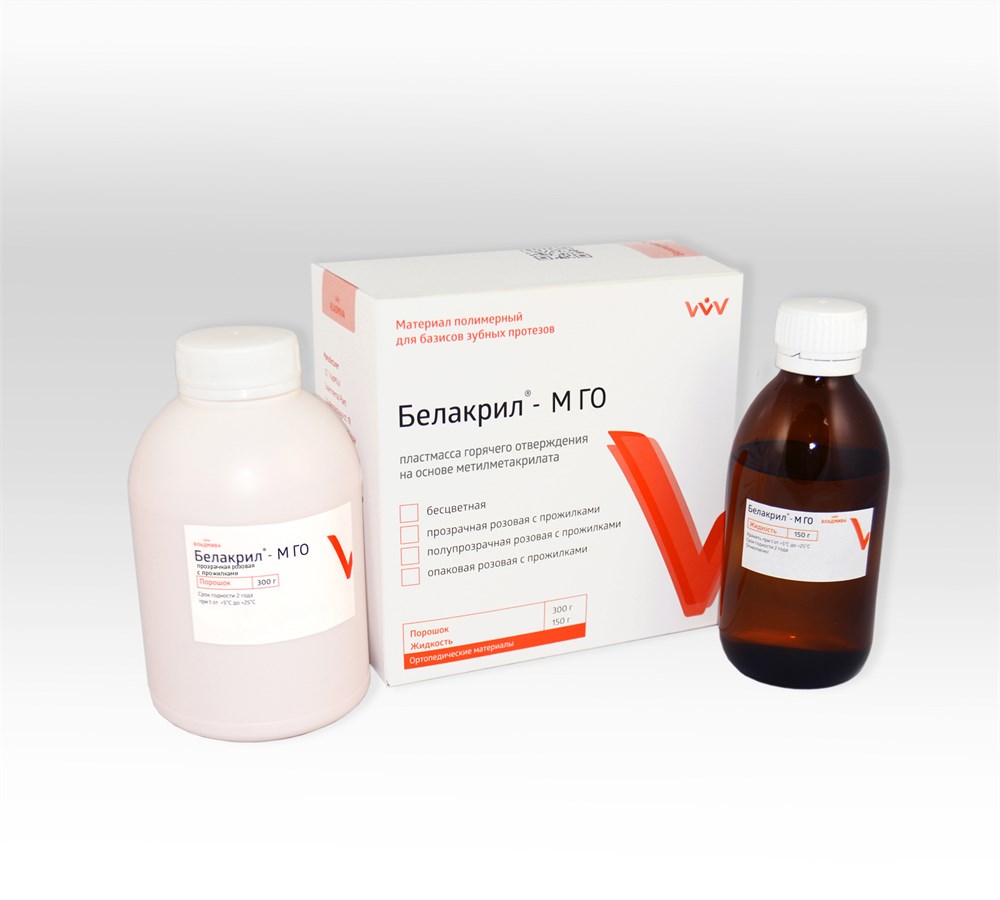 Базисные материалы «Белакрил» выпускаются в виде двух компонентов - порошка, содержащего полиэфиры метакриловой кислоты, катализатор реакции полимеризации перекись бензоила, и жидкости, содержащей мономер метилметакрилат (М) и/или мономер этилметакрилат (Э), после смешивания порошка с жидкостью образуется полимер, твердеющий при нагревании (горячего отверждения) - ГО или без нагревания (самотвердеющий) - ХО. Базисные материалы «Белакрил» отличает высокая технологичность, простота и быстрота изготовления изделий, имеющих высокое качество, функциональную долговечность, натуральный внешний вид и биосовместимость.