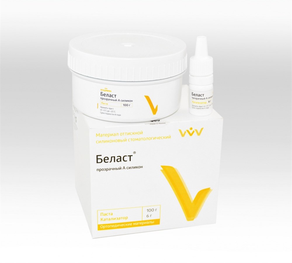 «Беласт» прозрачный - безусадочный силиконовый оттискный материал полимеризационного (А-силикон) типа, состоящий из основной пасты и платинового катализатора.