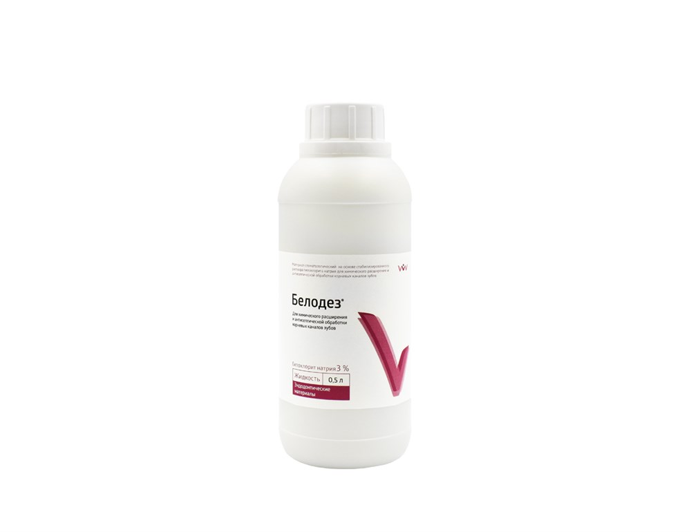 «Белодез» представляет собой стабилизированный раствор (гель) гипохлорита натрия, растворяет органическую основу дентина: как живые (химически фиксированные) так и некротизированные ткани. Гелеобразная форма выпуска позволяет успешно применять материал для антисептической обработки полостей зубов верхней челюсти, поскольку он обладает достаточной вязкостью, текучестью и щадяще воздействует на слизистую.