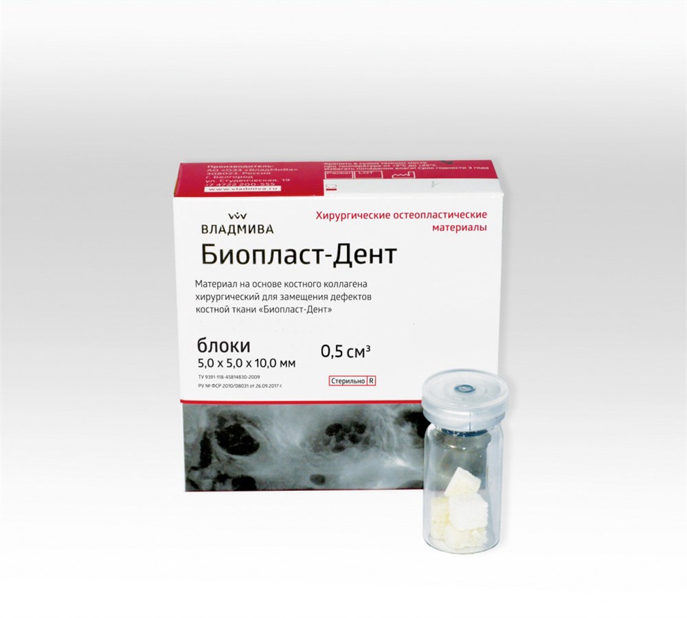 Материалы «Биопласт-Дент» представляют собой костную ткань КРС, очищенную методом химико-ферментативной обработки с сохранением гидроксиапатита биологического происхождения и пространственной архитектоники, что способствует фиксации биологически активных веществ на структурах биоматериала без снижения их биологической активности. Биоматериалы являются достаточно прочной, резорбируемой во времени матрицей (6-8 месяцев), со скоростью биорезорбции синхронизированной по времени с процессом образования новой ткани. Физиологическая резорбция протекает с образованием нетоксичных продуктов распада. Материалы являются идеальным остовом прорастания кровеносных сосудов и врастания клеток из костного ложа, т.к. обладают пористой структурой трабекулярной и диафизарной части трубчатых костей (микропоры, макропоры, гаверсовы каналы).