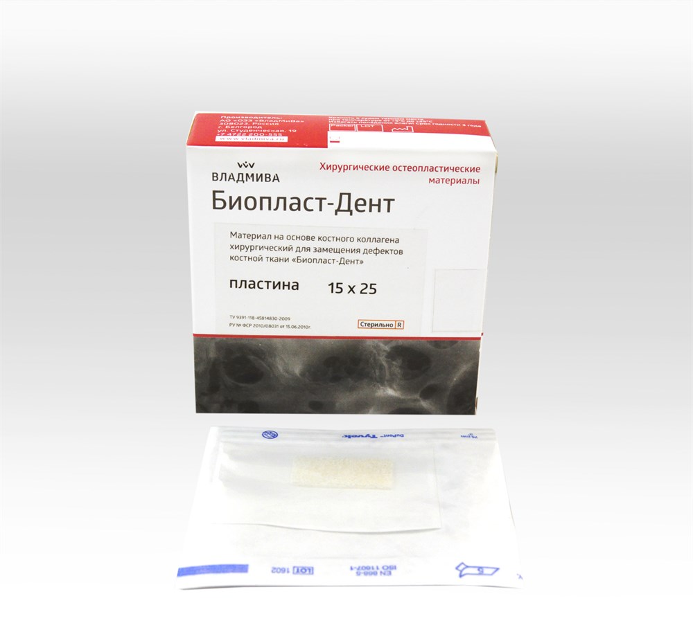 Материал хирургический на основе костного коллагена для замещения дефектов костной ткани «Биопласт-Дент» (пластина) предназначен для восстановления утраченного объема костной ткани после травматического удаления, как на ранней стадии, так и в отсроченном периоде в сочетании с различного рода имплантами и методиками направленной костной регинерации, в частности восстановления вестибулярной стенки альвеолы.
