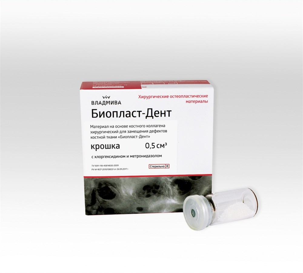 Материалы «Биопласт-Дент» представляют собой костную ткань КРС, очищенную методом химико-ферментативной обработки с сохранением гидроксиапатита биологического происхождения и пространственной архитектоники, что способствует фиксации биологически активных веществ на структурах биоматериала без снижения их биологической активности. Биоматериалы являются достаточно прочной, резорбируемой во времени матрицей (6-8 месяцев), со скоростью биорезорбции синхронизированной по времени с процессом образования новой ткани. Физиологическая резорбция протекает с образованием нетоксичных продуктов распада. Материалы являются идеальным остовом прорастания кровеносных сосудов и врастания клеток из костного ложа, т.к. обладают пористой структурой трабекулярной и диафизарной части трубчатых костей (микропоры, макропоры, гаверсовы каналы).