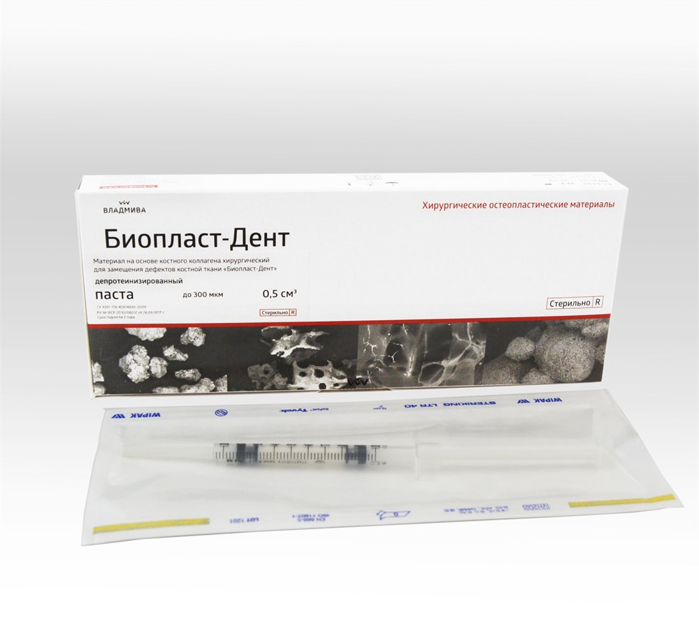 Паста «Биопласт-Дент» (депротеинизированный) представляет собой смесь, состоящую из увлажненных гранул кортикально-губчатой кости с размером гранул до 300 мкм и 200-1000 мкм.