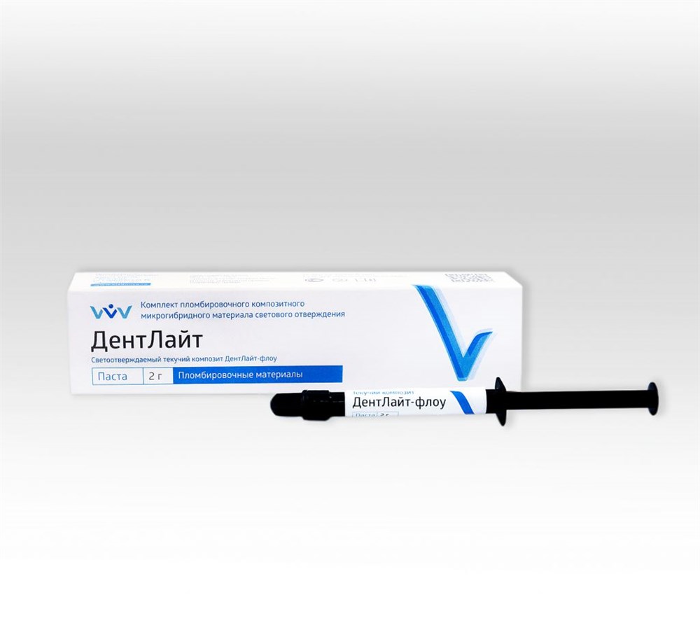 Текучий композитный материал «ДентЛайт» флоу представляет собой низковязкую светоотверждаемую пасту на основе метакрилатных олигомеров и модифицированного тонкодисперсного нанонаполнителя. Рентгеноконтрастный наполнитель представляет собой комбинацию модифицированных барийборалюмосиликатных кластеров (0,1-3 мкм) и наноразмерного диоксида кремния (5-75 нм).