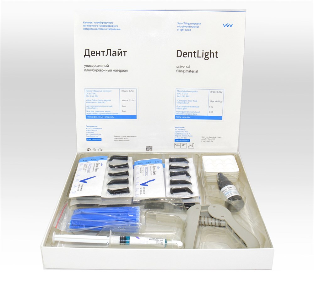 Микрогибридный композит «ДентЛайт» оттенка: ЕB2; ЕA2, ЕA3 OА3,5; DА3 Текучий композит «ДентЛайт»-флоу (A2) | 0,25 г х 70 0,25 г х 10 |