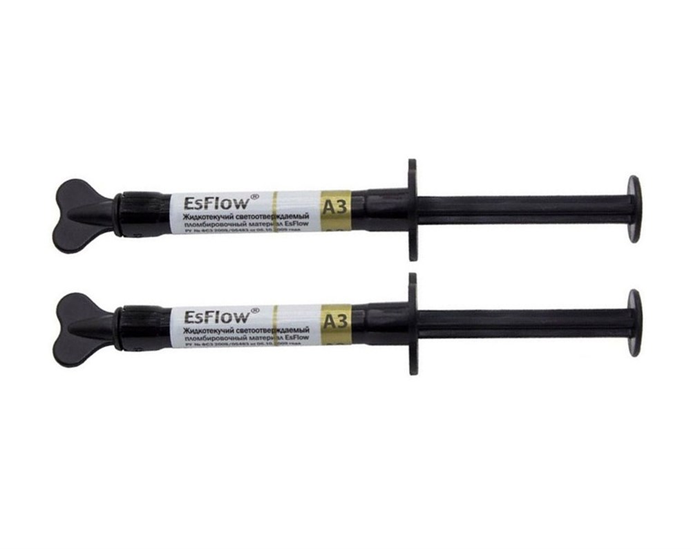 EsFlow A3 (ЭсФлоу А3) - это жидкотекучий светоотверждаемый пломбировочный материал. Средняя текучесть, наполненность 55% (по объему); компрессионная прочность 362МПа. Применяется при прямых реставрациях полостей всех групп (I-II - в качестве лайнера, III-V - для пломбирования).