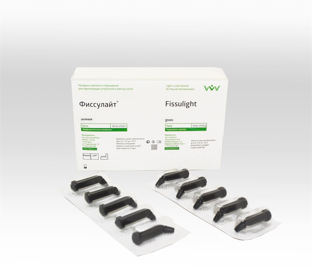 Герметик «Фиссулайт»-колор выпускается в виде пасты (белой, прозрачной и цветной с мерцающим эффектом). Цветные герметики удобно наносить и визуально контролировать во время запечатывания и последующих проверок. Яркая цветовая палитра (6 цветов) поможет завоевать доверие маленького пациента, предоставив ему возможность участвовать в процессе лечения при выборе цвета герметика. Входящие в состав герметика пищевые красители соответствуют нормам международных стандартов и не вымываются из отвержденного материала. Светоотверждаемый герметик позволяет экономить время. Шприцы с насадками для прямого применения дают возможность легко и точно наносить герметик на препарируемую фиссуру.