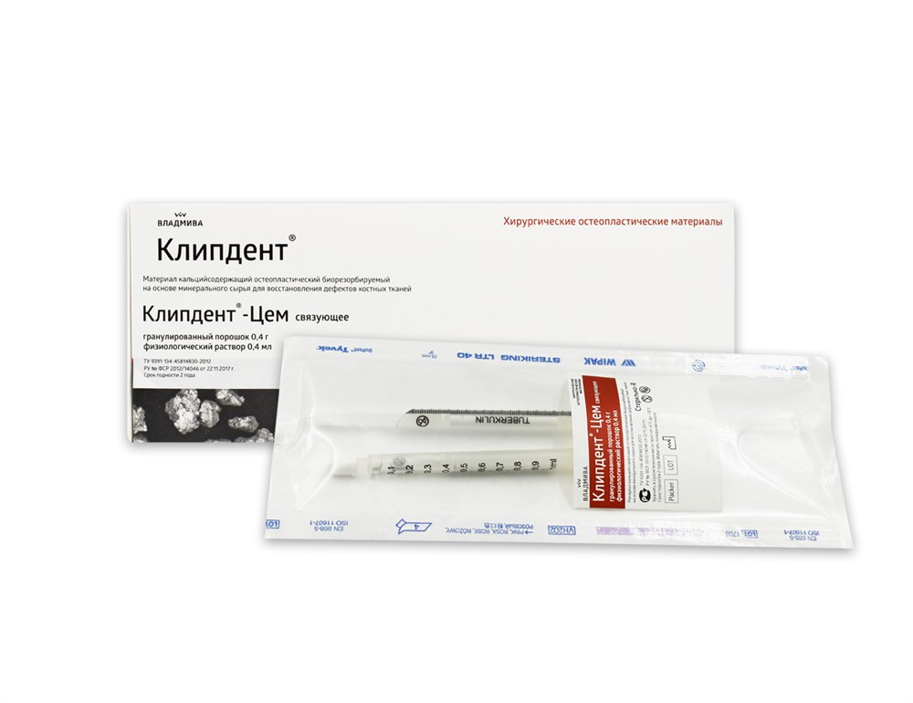 «Клипдент-Цем» связующее - синтетический, остеокондуктивный, резорбируемый материал для восстановления и реконструкции костных дефектов в челюстно-лицевой области состоящий из двухфазного сульфата кальция в форме гранулированного порошка и стерильного физиологического раствора.