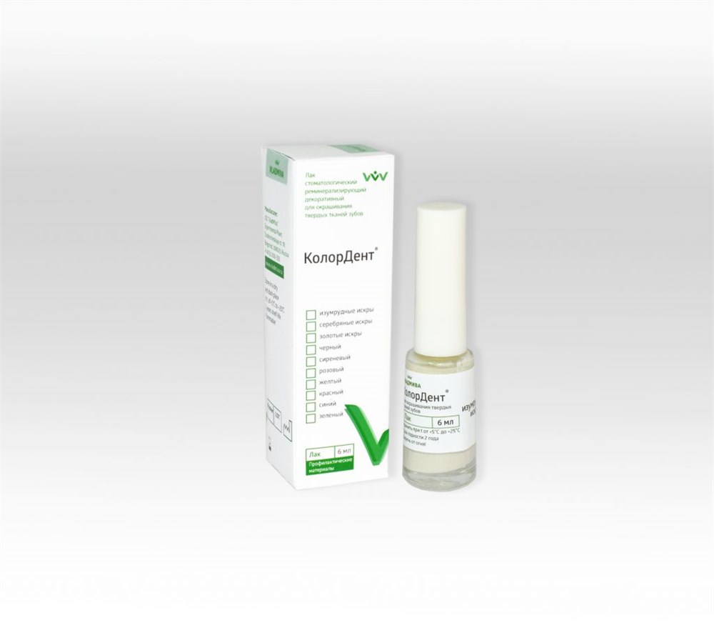 Лак «КолорДент» содержит: природный пленкообразователь, способный образовывать тонкую прочную пленку, обладающий антисептическими и бактерицидными свойствами; растворитель; загуститель; колеровочную пасту на основе диоксида титана или пигментов другого цвета, а также реминерализирующую добавку (гидроксиапатит), способствующую восстановлению минеральной структуры зуба.