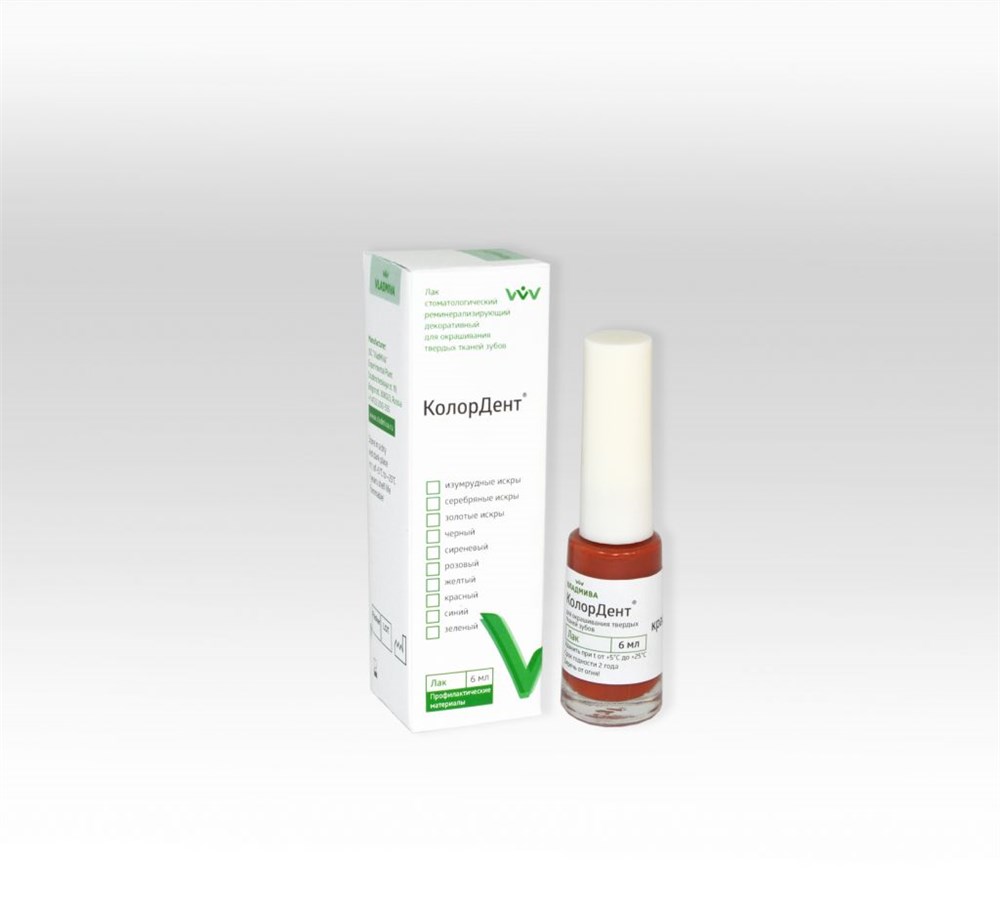 Лак «КолорДент» содержит: природный пленкообразователь, способный образовывать тонкую прочную пленку, обладающий антисептическими и бактерицидными свойствами; растворитель; загуститель; колеровочную пасту на основе диоксида титана или пигментов другого цвета, а также реминерализирующую добавку (гидроксиапатит), способствующую восстановлению минеральной структуры зуба.