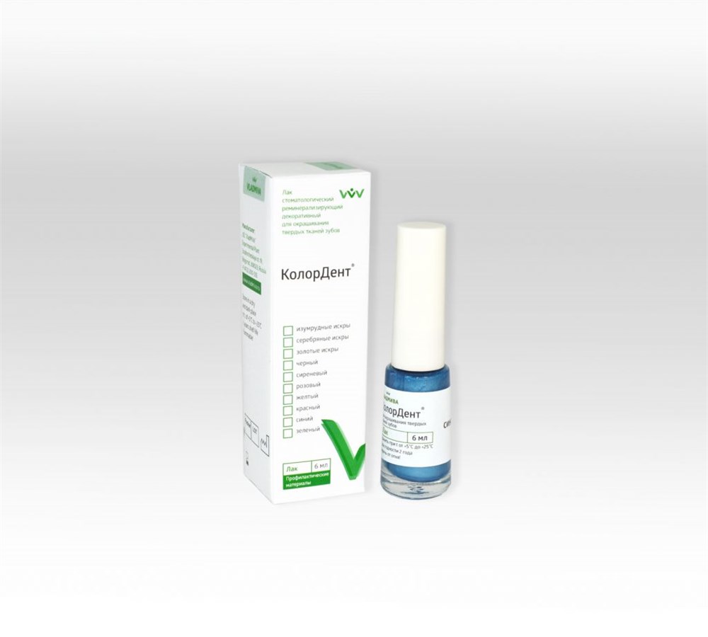 Лак «КолорДент» содержит: природный пленкообразователь, способный образовывать тонкую прочную пленку, обладающий антисептическими и бактерицидными свойствами; растворитель; загуститель; колеровочную пасту на основе диоксида титана или пигментов другого цвета, а также реминерализирующую добавку (гидроксиапатит), способствующую восстановлению минеральной структуры зуба.