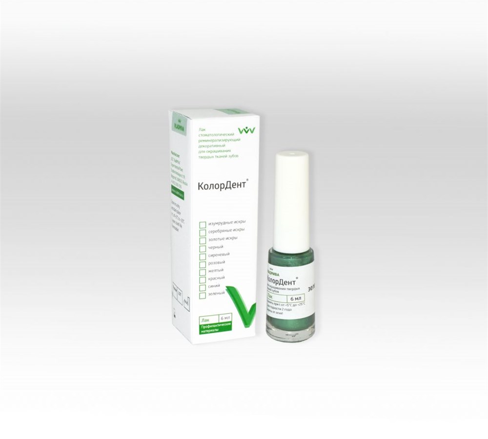 Лак «КолорДент» содержит: природный пленкообразователь, способный образовывать тонкую прочную пленку, обладающий антисептическими и бактерицидными свойствами; растворитель; загуститель; колеровочную пасту на основе диоксида титана или пигментов другого цвета, а также реминерализирующую добавку (гидроксиапатит), способствующую восстановлению минеральной структуры зуба.