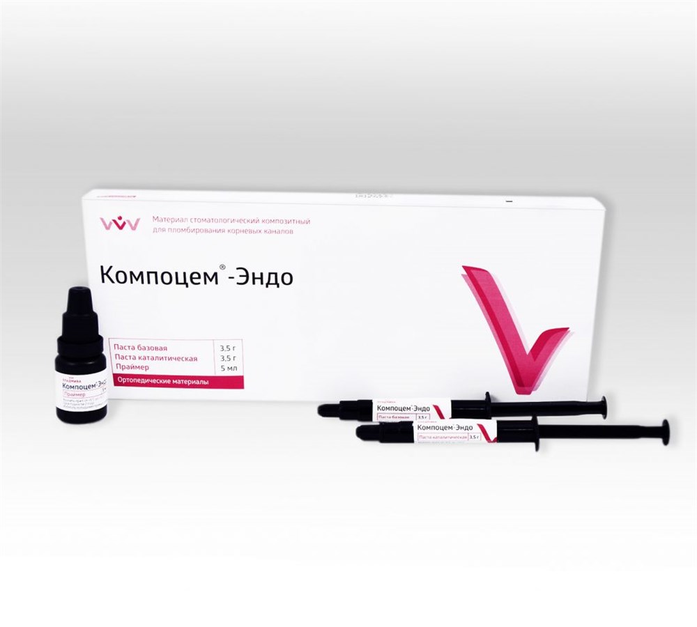 Материал «Компоцем-Эндо» представляет собой рентгеноконтрастный текучий композит на основе многофункциональных метакриловых олигомеров и наноструктурного гидроксилапатита, относится к материалам двойного механизма отверждения (химического и светового) и выпускается в виде двух паст (базовой и каталитической).
