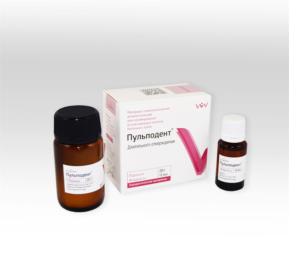 Жидкость содержит дексаметазон, формальдегид, фенол, эвгенол. При смешивании порошка и жидкости материала «Пульподент» в соотношении 2:1 образуется однородная пластичная паста, которую в течение 5-7 минут можно легко ввести в пульпарную камеру и устья канала зуба. Паста хорошо адаптируется к стенкам полости зуба и, постепенно теряя пластичность, затвердевает в течение 20-25 минут. Наличие мумифицирующих и антисептических компонентов в материале «Пульподент» позволяет провести лечение быстро и безболезненно для пациента. «Пульподент» длительного отверждения характеризуется более продолжительным рабочим временем (10-15 минут) и временем отверждения (60 минут), дезинфицирует корневые каналы, способствует резорбции гранулемы и регенерации периапикальных тканей.