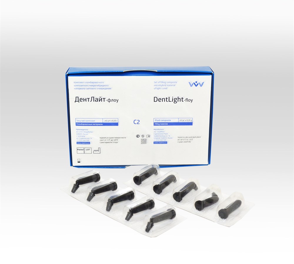 Текучий композитный материал «ДентЛайт» флоу представляет собой низковязкую светоотверждаемую пасту на основе метакрилатных олигомеров и модифицированного тонкодисперсного нанонаполнителя. Рентгеноконтрастный наполнитель представляет собой комбинацию модифицированных барийборалюмосиликатных кластеров (0,1-3 мкм) и наноразмерного диоксида кремния (5-75 нм).