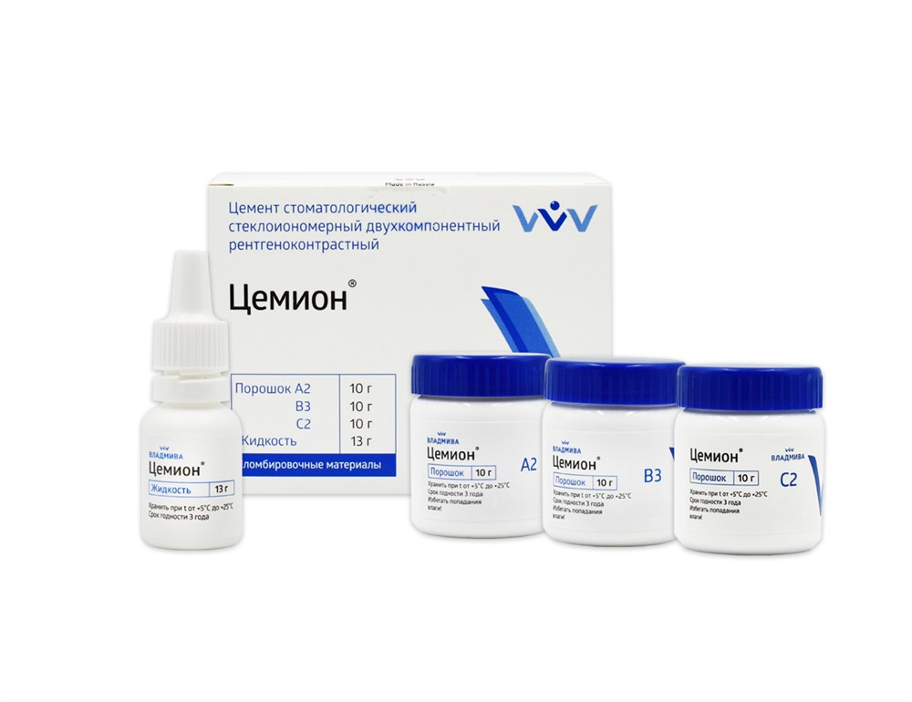 «Цемион» — традиционный стеклоиономерный цемент химического отверждения, обладающий химической адгезией к дентину и эмали. Выпускается в виде комплекта порошок-жидкость. «Цемион» образуется при смешивании порошка и жидкости. Порошок представляет собой измельченное алюмофторсиликатное стекло, жидкость – водный раствор модифицированной полиакриловой кислоты.